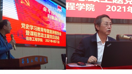 4月21日下午,由信息工程学院党委主办、电子工程教研室党支部承办的党史学习教育专题宣讲报告会暨课程思政主题党日活动在北教学楼C105多媒体教室进行。校党史学习教育“十百千”宣讲团成员、校党委副书记、校长金志农出席并做“学史力行,智慧兴水”专题宣讲。信息工程学院党政班子成员、各党支部书记、各教研室主任(专业负责人)、电子工程教研室党支部全体党员教师、学生党员和部分电子信息工程专业学生共百余人参加。
