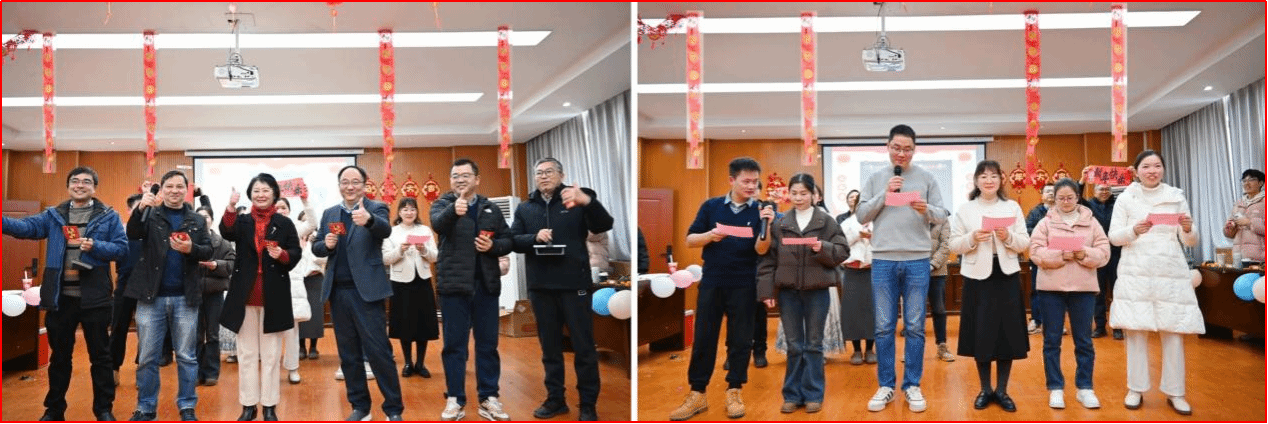 学院党政负责人回顾了2025年学校更名大学辉煌成就和学院砥砺前行奋进征程,向全体教职工辛勤付出致以诚挚感谢,送上新年美好祝福,并带领全体行政人员集体朗诵《“红芯璀璨”信工2025实干答卷》,每位老师将自己分管领域工作凝练成朗朗上口的语句表达,以生动形式再现了学院过去一年的奋斗足迹和工作亮点。