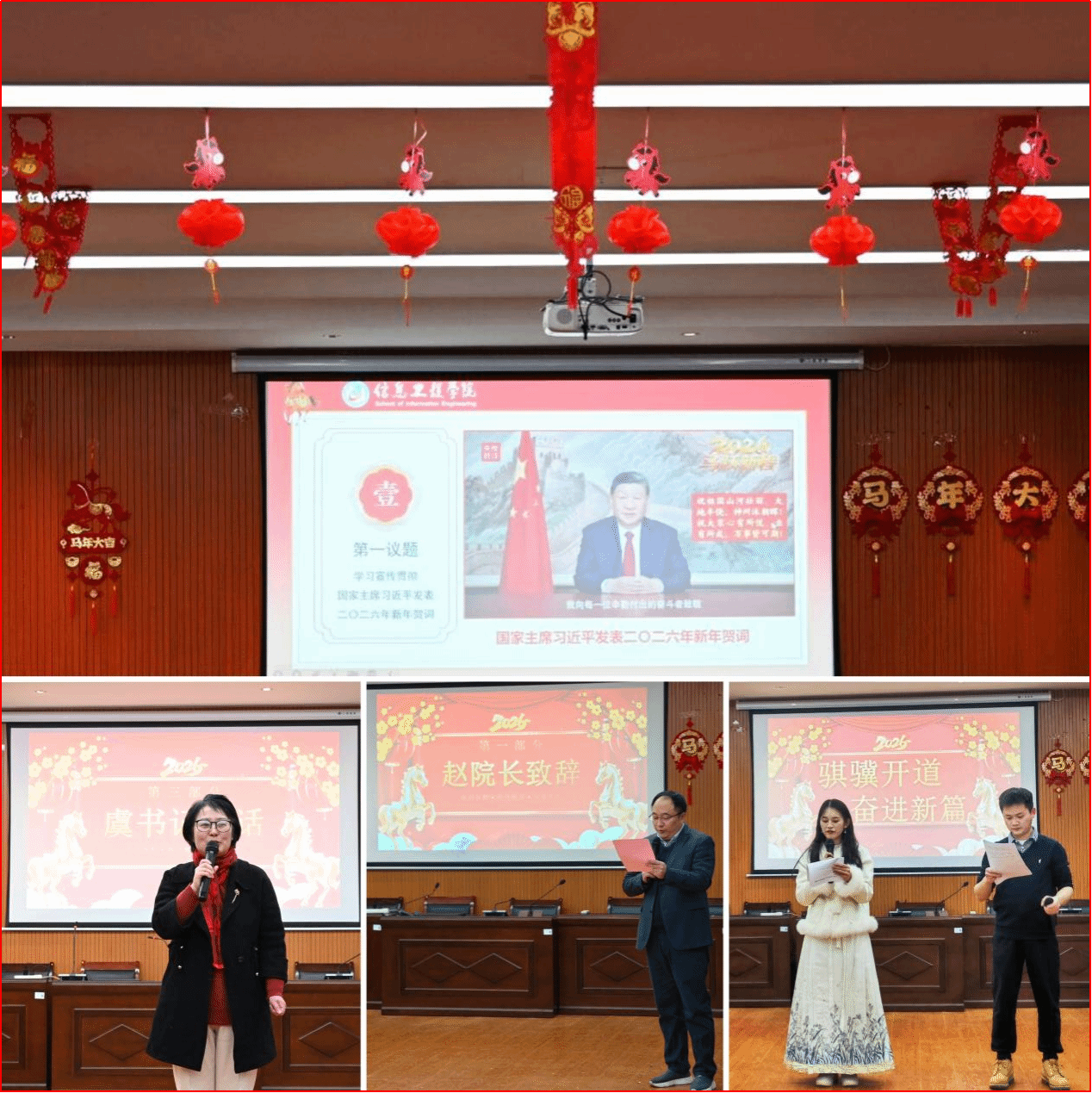 为凝聚全院教职工奋进力量,营造团结和谐、积极向上的氛围,1月6日下午,信息工程学院在信工楼A208举办了“信工骐骥奋蹄疾,共绘新篇气象新”2026年新春茶话会。全院教职工欢聚一堂,共话2025年发展成就,喜迎2026年新春到来。活动由学院工会承办,辅导员田晨、科研助理罗甜主持。