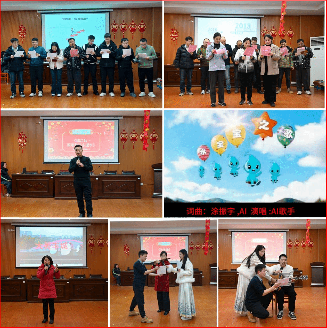 各教研室也献上了精心编排的文艺节目,现场气氛热烈,掌声与欢笑声此起彼伏。学院2025年新引进博士集体情景表演《我爱科研》,幽默风趣、积极乐观,闪烁着青年高知群体的智慧光芒和青春活力;电子工程教研室集体朗诵《“芯”中有爱,“电”亮讲台》,将课程思政与专业教育场景融为一体,充分展现了教育部全国党建样板支部教师爱岗敬业和心系学生的红烛精神;通信工程教研室杨清老师男中音独唱《临江仙·滚滚长江东逝水》浑厚有力、大气磅礴;数据科学与大数据教研室涂振宇教授原创歌曲《水宝宝之歌》活泼可爱、朝气蓬勃,表现出深厚的爱校荣校情结,雷金娥老师女高音独唱《大美丰城》(涂振宇原创)声情并茂、优美动听,传递出浓浓的家国情怀;计算机基础教研室王员云教授笛子独奏《牧羊曲》悠扬婉转,勾勒出清新自然的意境;计算机系统结构教研室汤玉明博士吉他弹唱《我只在乎你》则深情款款,指尖拨动的是岁月的弦,歌声里流淌着时光冲不淡的挚情。