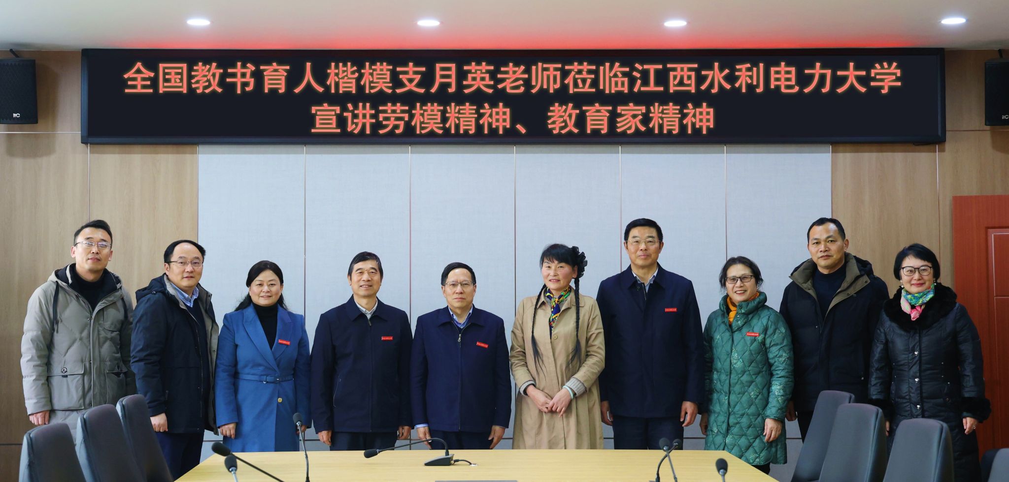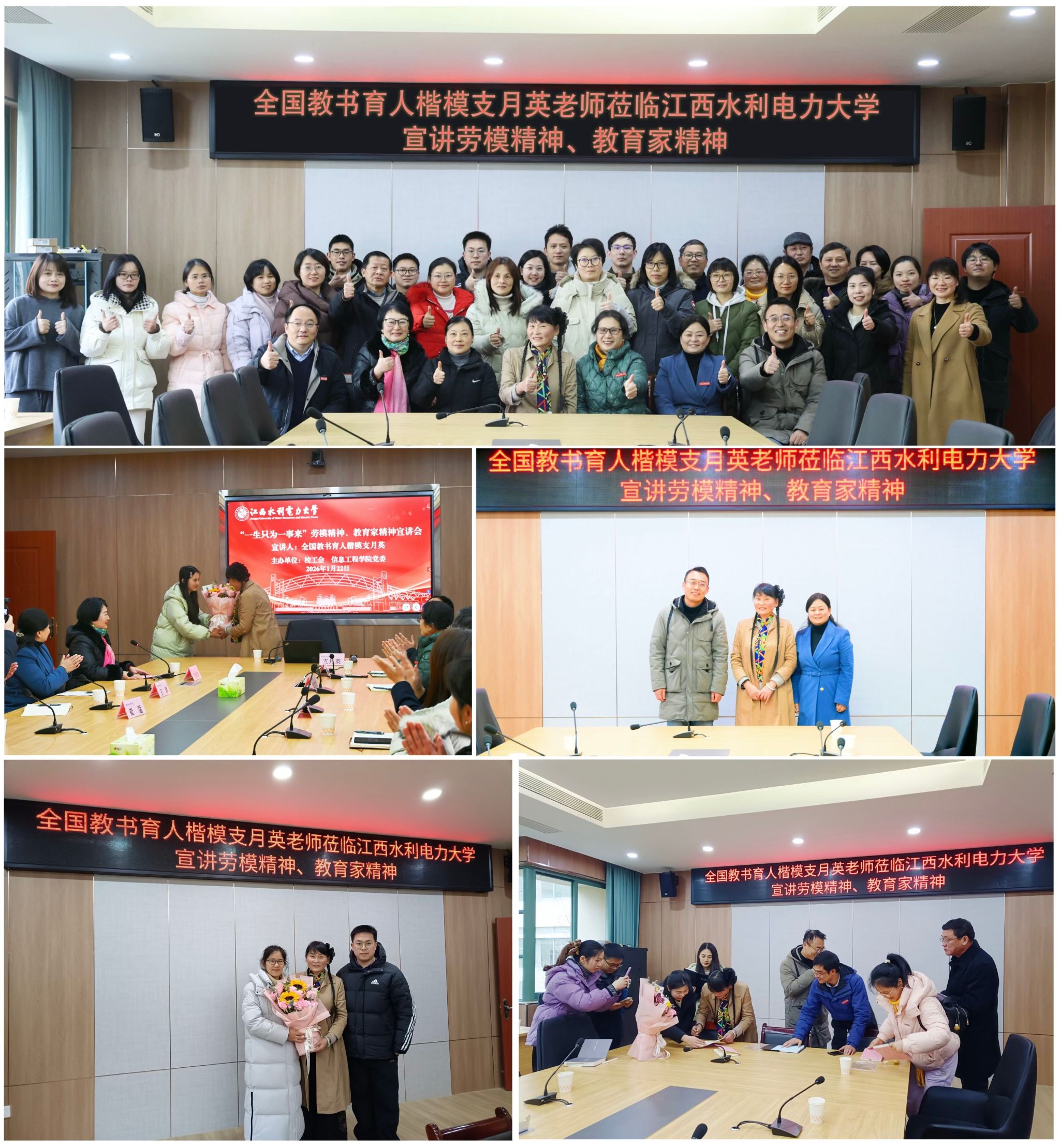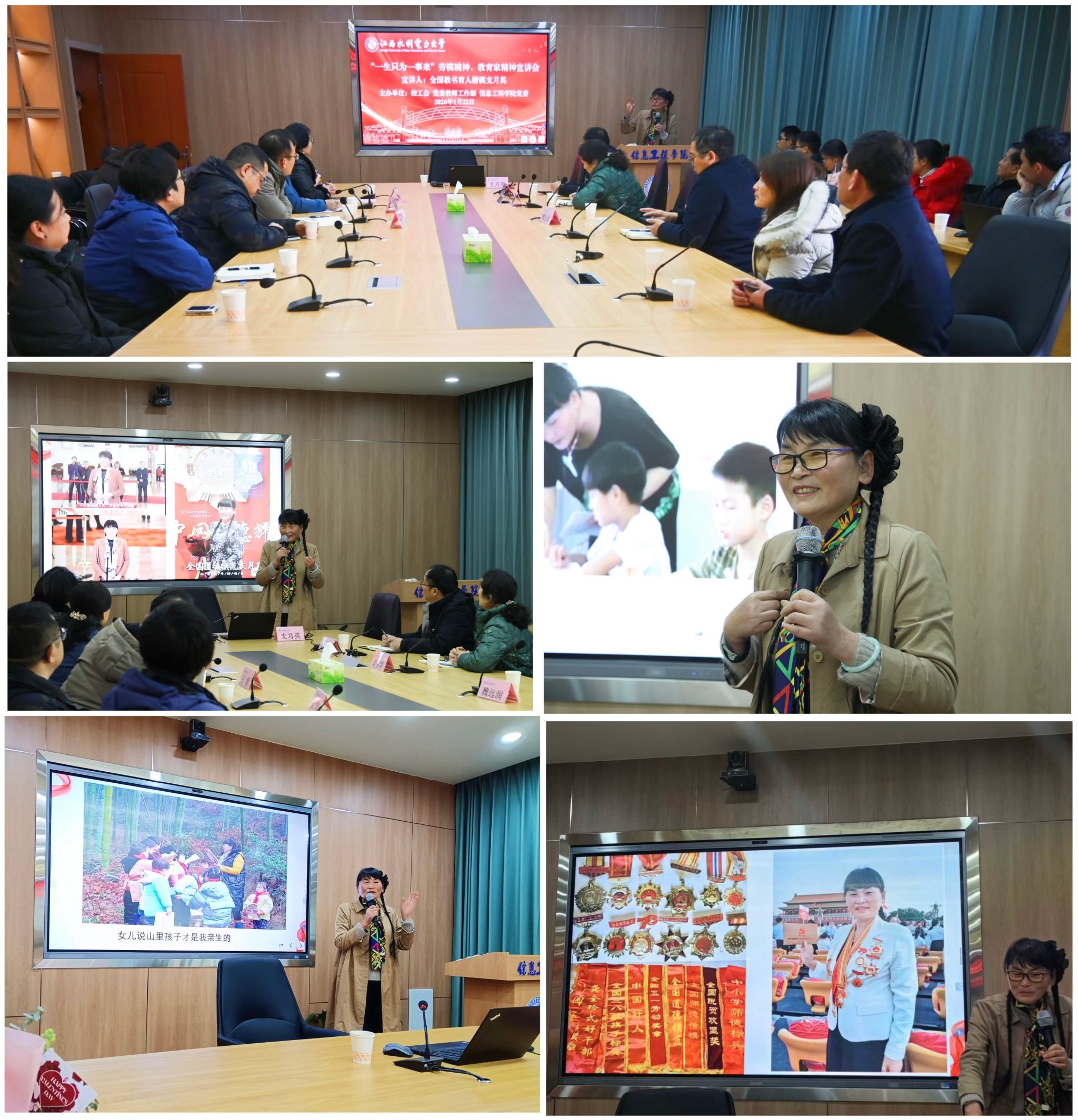 为深入学习宣传贯彻习近平总书记关于教育的重要论述和全国教育大会精神,弘扬劳模精神、教育家精神,凝聚育人奋进力量,1月22日,由校工会、校党委教师工作部、信息工程学院党委联合举办的“一生只为一事来”劳模精神、教育家精神宣讲会在信工楼A204隆重召开,全国教书育人楷模支月英老师应邀主讲。校党委书记汪胜前、副书记吴泽俊、副校长陆伟锋在宣讲会前与支月英老师亲切会面。校工会主席胡盛华、全国优秀教师王颖教授、全省模范教师崔猛教授、各基层工会主席和委员、信息工程学院领导班子成员和教师代表共50余人参加。