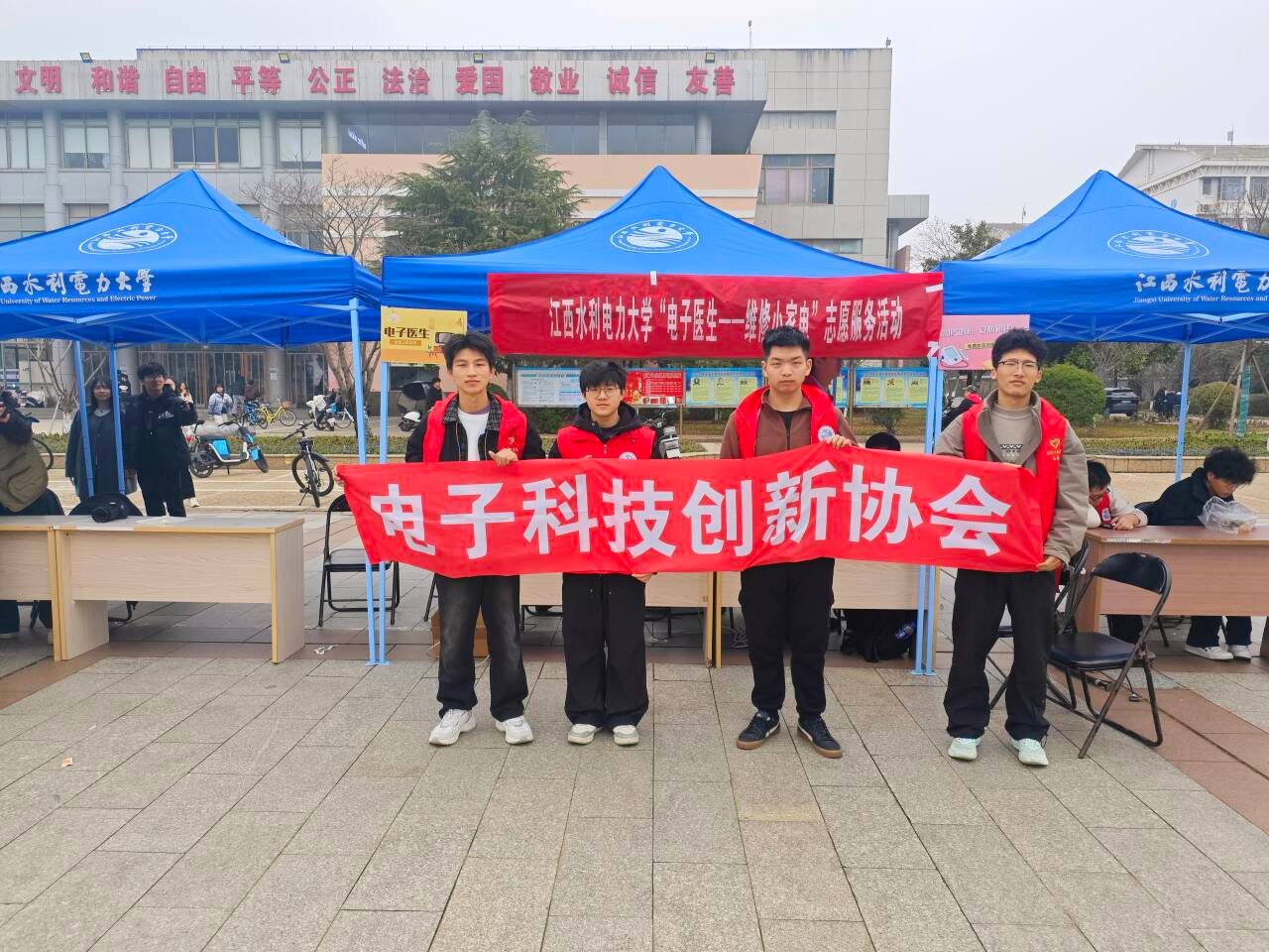 在第63个学雷锋纪念日到来之际,为深入传承和弘扬雷锋精神,引导青年学生以实际行动践行“奉献、友爱、互助、进步”的志愿精神,3月5日,信息工程学院在润园门前开展“3.5雷锋日”主题服务活动,发挥专业特长,为师生提供小电器义务维修服务,学院党委相关负责人到场。