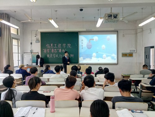 为加强学院学风建设,营造学院优良学风,树立班级间的榜样带头作用,信息工程学院于5月10日,在南B102举办了以“善学,善思,善为”为主题的优良学风创建班级答辩活动。信息工程学院党委副书记章蔚中、全体辅导员、部分班主任老师及学生干部代表共计百余人参加了本次创评答辩会。