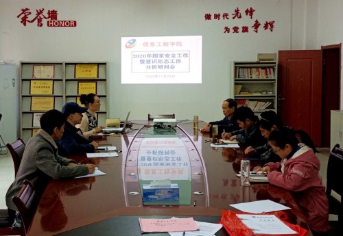 2020年11月25日,信息工程学院在电子信息楼A202会议室召开国家安全工作暨意识形态工作分析研判会,学院党委班子成员、专职组织员、综治联络员、和党政办公室相关人员参加,学院党委书记虞菊英主持。