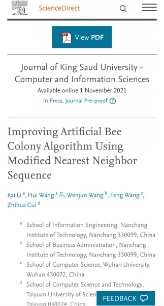 近日,以我校信息工程学院2018级计算机科学与技术01班本科生李凯为第一作者,王晖教授课题组最新研究成果论文《Improving Artificial Bee Colony Algorithm Using Modified Nearest Neighbor Sequence》被国际期刊《Journal of King Saud University - Computer and Information Sciences》(IF=13.473)接收发表,王晖教授为通讯作者,南昌工程学院信息工程学院为第一署名单位,合作单位包括武汉大学和太原科技大学。