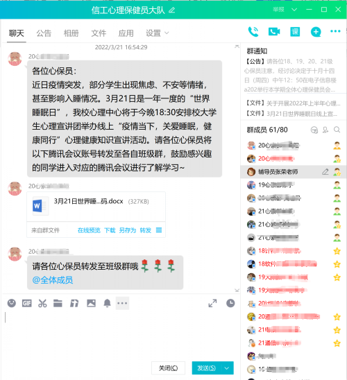 构建体系,确保疫情下心理健康教育顺利开展。学院构建了“学院—班级—社区”三级心理健康网络体系,将学院辅导员、班主任、学院心素部、班级心保员、社区管理员联动起来,为心理健康教育工作顺利开展提供保障。疫情封闭管理期间,有部分毕业生因为复试和面试没有合适场地等产生心理焦虑,学院迅速开放7个办公室给毕业生进行网络咨询、面试等,努力缓解毕业生的焦虑情绪。