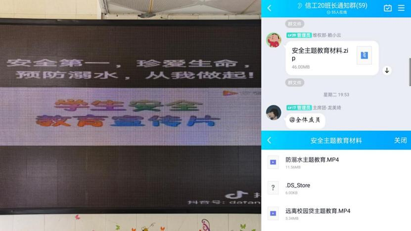 本次主题教育活动在线下于各楼栋的电子屏幕播放防溺水教育短片,线上在安全委员群与班长群中分享安全教育知识资料进行广泛宣传,以达到防溺水安全知识全院覆盖,人人知晓。同时,各班级积极召开线上防溺水主题班会,班主任和班委协同组织,结合PPT与教育影片内容,列举出许多大学生意外溺水的惨痛事故,敲响了同学们防溺水的警钟,让同学们深刻认识到防溺水的重要性,并带领同学们学习了解防溺水的基本常识、自救与救人的正确方法,最后动员同学们朗读防溺水“六不准”与“七不要”。