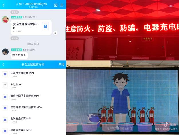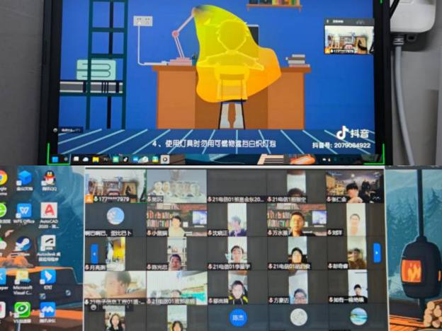学院在线上通过各班级的班委、班主任向同学们积极传达消防安全知识,让消防安全知识精准深入每个班,并在线下充分借助楼栋中电子屏和电子横幅,利用其传达效率快,播放时间不受限制等优势不断向同学们输送消防安全知识。在疫情严峻的形势下,本次主题班会由各班班主任于班委通过授课平台线上举行,班主任通过讲解大学生消防安全典型案例结合制作的PPT为同学们上了一场深刻的消防教育课。