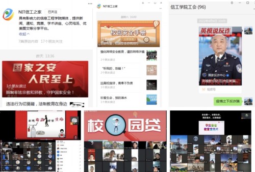 学院通过微信公众号发布推文、线上召开主题班会、微信群等途径广泛在师生中开展平安校园建设主题宣传,开展了国家安全、防范抵御非法宗教和邪教宣传教育,电信网络诈骗安全主题教育活动、禁毒主题教育活动、网络信息安全宣传教育主题活动、校园贷主题宣讲活动、防溺水主题教育、以及消防安全主题教育活动,同时还开展了疫情防控期间心理健康教育。