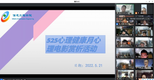 为促进大学生身心健康发展,营造积极乐观、健康向上的校园氛围,信息工程学院于5月21日晚通过线上会议形式开展心理电影赏析活动,学院64名同学参与了此次观影赏析活动。