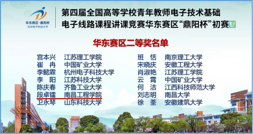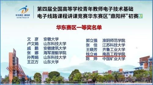 近日,从教育部高等学校电工电子基础课程教学指导委员会、中国电子学会电子线路教学与产业专家委员会、全国高等学校电子技术研究会传来喜讯,我校信息工程学院青年教师钱立峰、段卓镭分别荣获第四届全国高等学校青年教师电子技术基础、电子线路课程讲课竞赛华东赛区“鼎阳杯”初赛一等奖、二等奖,创我校参加同类型同级别比赛获奖新高。钱立峰老师将代表我校参加全国总决赛。