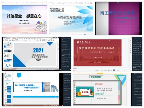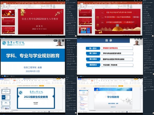 9月11日至14日,信息工程学院以线上会议、线下实践形式陆续开展2022级新生专题入学教育。由学院党政领导班子成员、教务办公室、学生工作办公室全体辅导员老师主讲,450余名新生参加入学教育。