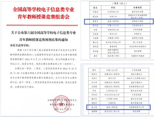 近日,第六届全国高等学校电子信息类专业青年教师授课竞赛传来喜讯,信息工程学院青年教师钱立峰、曾翠平获得华东赛区二等奖,两位老师将于10月28日-30日代表我校参加全国总决赛。