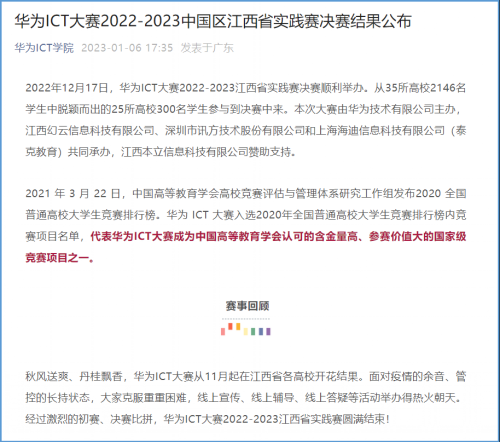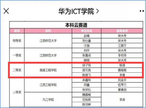 近日,华为ICT大赛2022-2023江西省实践赛决赛顺利结束,我校信息工程学院参赛队伍荣获本科云赛道二等奖,这是我校首次组队参加该项赛事并获奖。