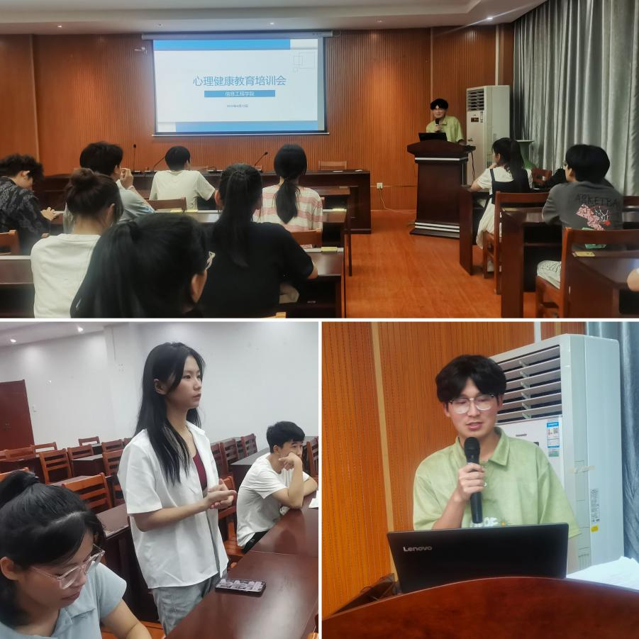 为加强学院学生心理健康教育队伍建设,提高心理保健员的工作水平和专业素养,6月12日,信息工程学院在信工楼A208举办“告别‘emo’重‘心’快乐”心理健康教育培训会。校大学生心理宣讲团成员郭屹立应邀宣讲,学院各班级心理保健员20余人参加。