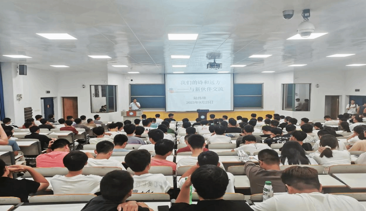 陆伟锋为2023级新生讲授“开学第一课”。课上,陆伟锋首先通过自身人生不同阶段的三张照片引发同学们思考,用质朴的语言与同学们分享了自己的成长经历和感悟,为同学们过好大学生活、融入学校发展指明方向,并强调作为青年学生,要立志做有理想,敢担当,能吃苦,肯奋斗的新时代好青年。