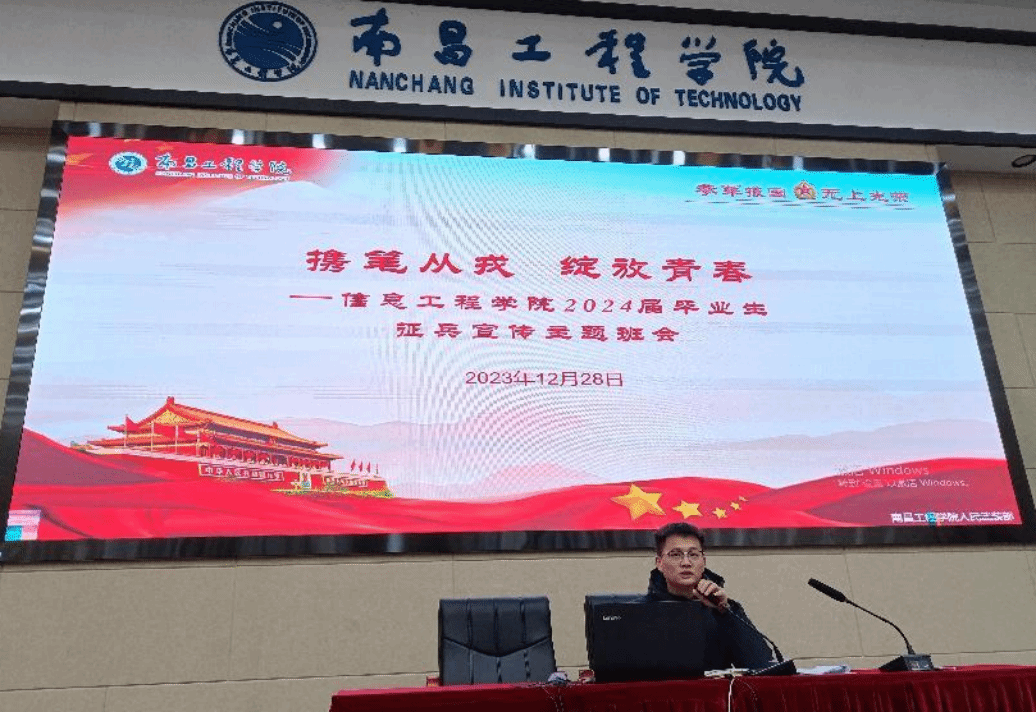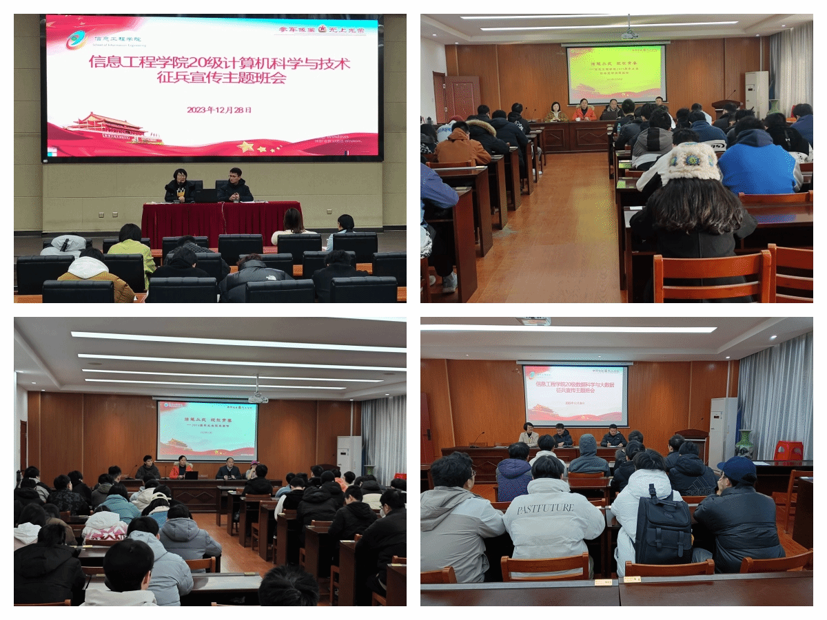 为贯彻落实国家征兵政策,宣传大学生征兵入伍政策,进一步鼓励和引导大学生应征入伍,信息工程学院2024届毕业班于12月28日在信工楼A208和教学北楼C105召开征兵宣传主题班会,学院党政负责人、专业负责人、就业辅导员、班主任以及全体2024届毕业生参加。