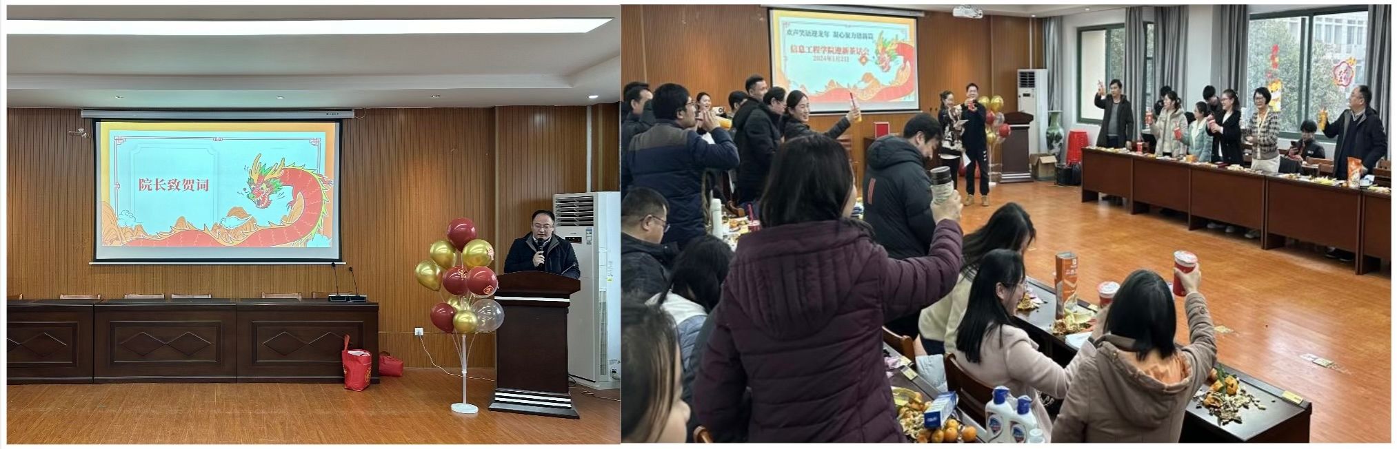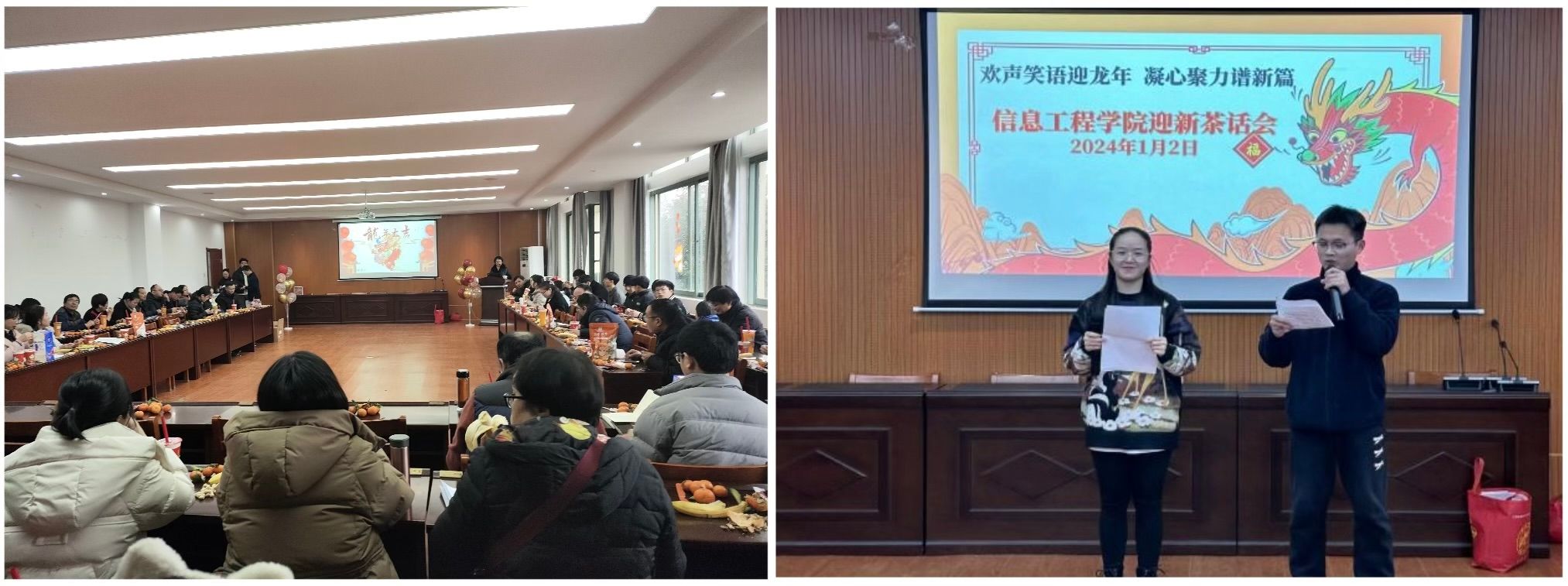 为增进教职工之间的感情,缓解一年来的工作压力,增加教职工的集体归属感,有效提升团队凝聚力,1月2日下午,信息工程学院工会在信工楼A208会议室举办2024年新春茶话会。学院领导班子成员和全体教职工欢聚一堂,在学习体会习近平总书记2024年新年贺词中吸取力量,辞旧迎新,共话发展。活动由辅导员谭酉群和田晨主持。