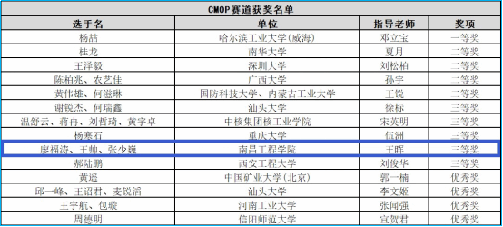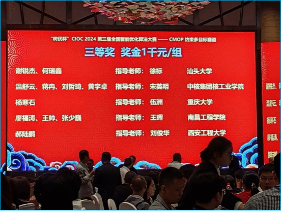 近日,“树优杯”第三届全国智能优化算法大赛在江苏无锡落下帷幕。由信息工程学院王晖教授指导,电子信息专业研究生组成的队伍(参赛队员:廖福涛,王帅,张少巍)经过初赛、决赛和答辩,最终在约束多目标优化(CMOP)赛道上取得全国三等奖的优异成绩。