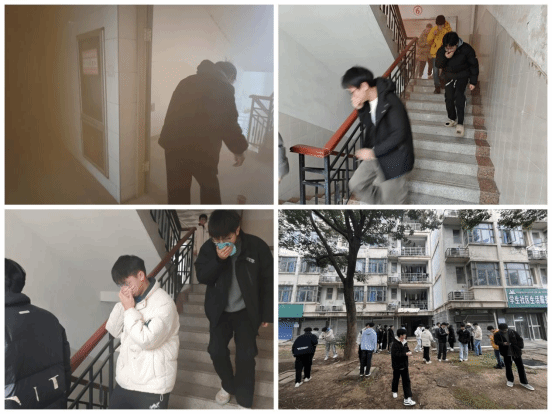 上午11点,随着烟雾弹释放,演练正式开始。浓烟迅速弥漫,烟雾报警器随即响起警报声,提醒楼内人员撤离。在楼干和学生干部的引导下,同学们迅速用湿毛巾捂住口鼻,弯腰低姿,沿着疏散路线有序撤离至安全区域,整个过程紧张有序,达到了预期效果。