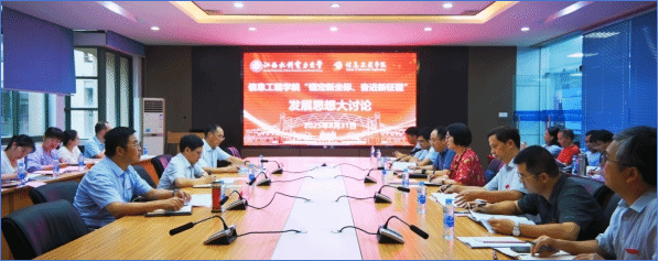 为深入贯彻落实学校2025年暑期研讨会精神,进一步解放思想、凝聚共识,全面谋划人工智能学院未来发展,深入推进信息工程学院改革创新,8月31日下午,信息工程学院在信工楼B204会议室举办了“锚定新坐标、奋进新征程”发展思想大讨论。会议由信息工程学院院长赵嘉主持,学院班子成员、各教研室主任、专业负责人、实验中心主任、各党支部书记、行政坐班人员及教师代表参加。校党委书记汪胜前、校长刘祖文、副校长陆伟锋应邀莅临指导并讲话。