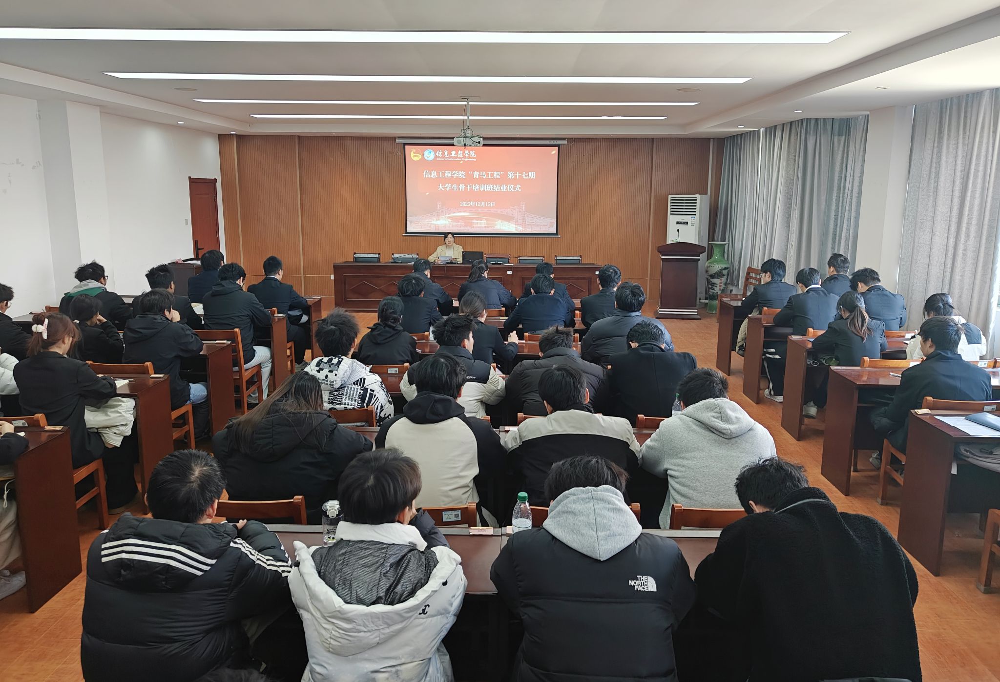 12月15日,信息工程学院在信工楼A208举办第十七期“青马工程”培训班结业仪式,学院团委负责人和全体青马班学员参加。
