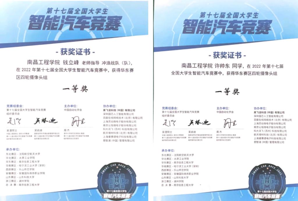 近日,第十七届全国大学生智能汽车竞赛在南京信息工程大学落下帷幕,我校推荐的6只参赛队伍共获得华东赛区一等奖1项、二等奖3项、三等奖2项。其中,在四轮摄像头组中荣获一等奖、智能视觉组中荣获二等奖、平衡信标组中荣获二等奖、极速越野组荣获二等奖,平衡单车组荣获三等奖,四轮电磁组中荣获三等奖。参赛队伍指导老师为信息工程学院电子工程教研室王颖、钱立峰和曾任贤。