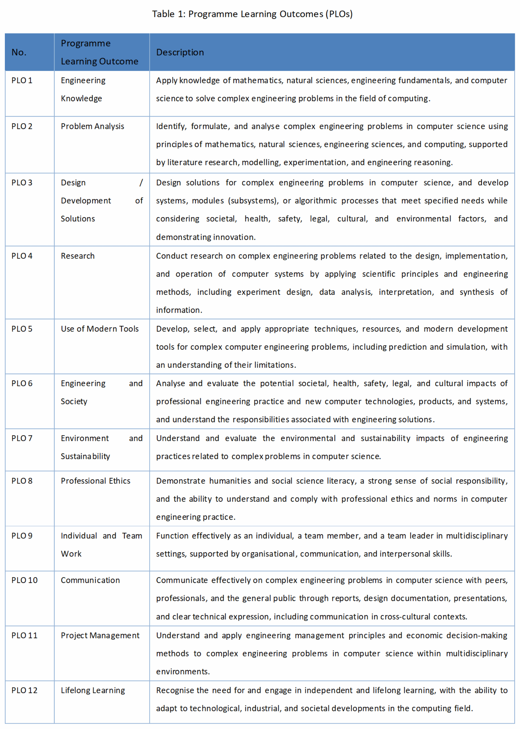 In order to realise the above PEOs, the Computer Science and Technology programme has defined twelve Programme Learning Outcomes (PLOs).
